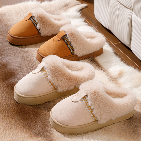 新款麂皮绒加绒保暖秋冬包头懒人一脚蹬棉拖鞋毛口厚底皮带扣装饰
