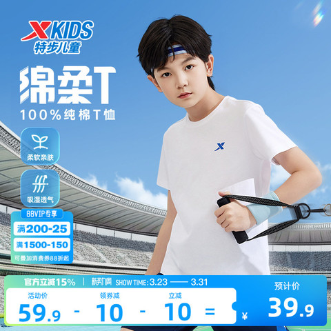 特步童装儿童纯棉短袖T恤男女童运动上衣夏中大童短T运动服打底衫