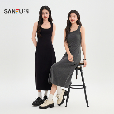 三福吊带连衣裙女2026新款夏季方领无袖修身显瘦背心裙长裙子女装