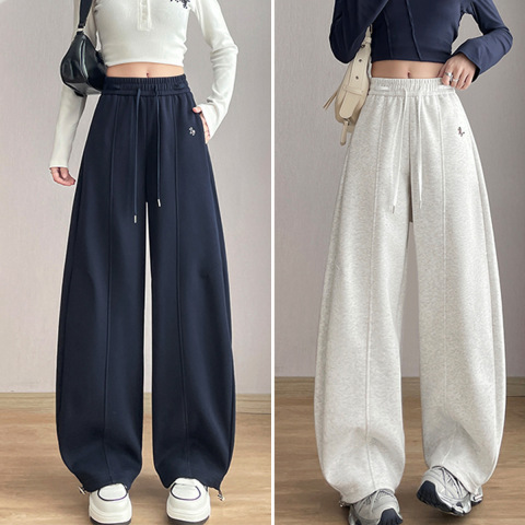 2026春秋新款刺绣小马棉卫裤高腰束脚两穿阔腿裤女春季薄款休闲裤
